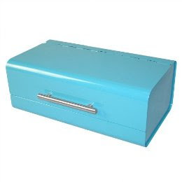 I've been wanting a bread box (yeah, I know, people think I'm weird) but not only is this a bread box... it's old looking and it's turquoise. We have turquoise retro kitchen chairs*, I kid you not, so this is awesome.